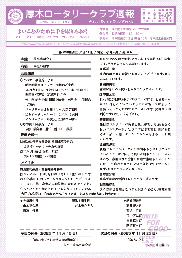 第3136回例会 幹事報告