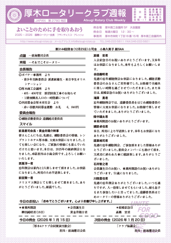 第3144回例会 会長報告